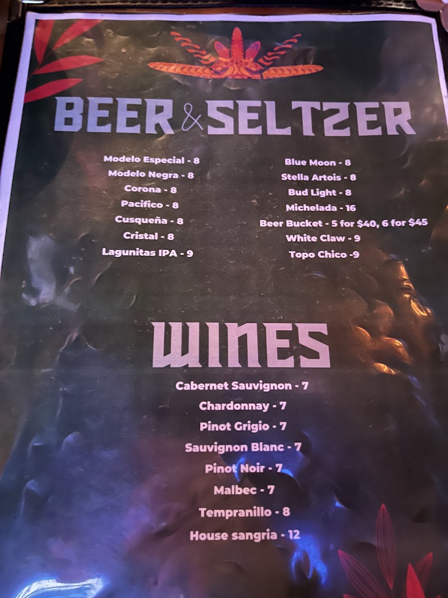 Little neck clams, prawns, halibut, aji limo tiger's milk, Peruvian, scallop, crab, calamari and fried sweet potato