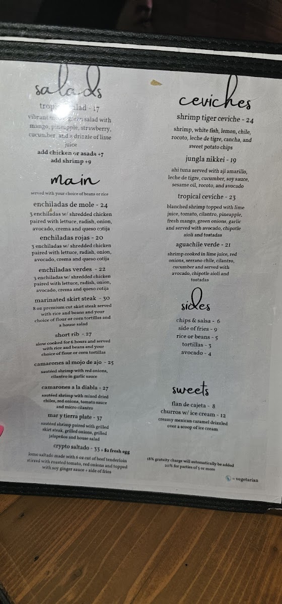 Aji amarillo tigers milk, fried salmon skin, cherry tomatoes, sesame seeds and avocado